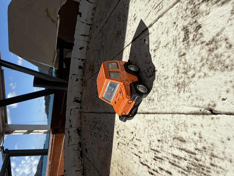 An orange toy off-road vehicle, resembling a Jeep Wrangler with "SPORT" printed on its side, rests on a weathered wooden surface in the foreground