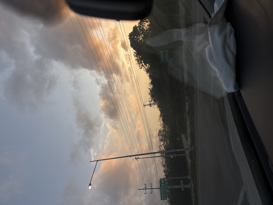 Captured from inside a vehicle, the image shows a road lined with dense trees stretching to the horizon. A series of electrical poles and wires crisscross the sky, which is filled with a mix of dark and light clouds tinged with golden hues from the setting sun. A street lamp is visible on the left side of the road. Road signs are partially visible, indicating destinations or street names.