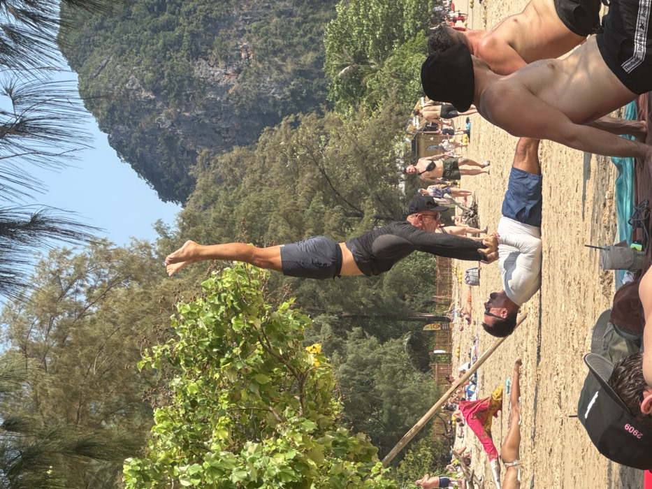 This image depicts a busy sandy beach in Ban Ao Nang, Thailand, under bright daylight. In the central foreground, two adult males are engaged in an acrobatic balance. One male, wearing a black long-sleeved athletic shirt and dark shorts, is performing a handstand-like pose, balancing his hands on the upturned feet of a second male. The second male is lying supine on the sand, wearing a light long-sleeved shirt, dark blue shorts, and sunglasses, with his legs raised and bent to support the first male. To the immediate foreground, a person is partially visible lying prone on a dark mat, wearing a black baseball cap. Adjacent to them, another person sits shirtless, facing right, wearing black shorts. A glass with a beverage and a straw rests on a mat nearby. The midground features numerous other individuals scattered across the sand, some walking, others lounging on towels or mats. One person in the mid-left is seen lying down in a vibrant pink patterned outfit. Yellow objects are distributed across the sand. The background consists of a dense line of tropical trees and foliage bordering the beach, with a large, steep, forested limestone mountain prominently rising under a clear blue sky. Overhanging pine-like branches are visible at the top of the frame.
