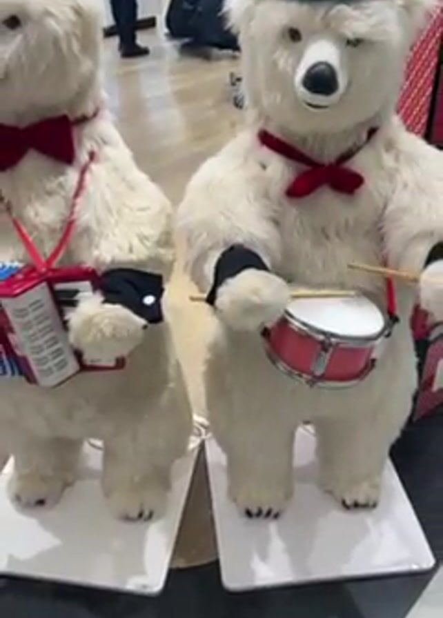 Two white polar bear automatons are standing side-by-side. The polar bear on the left plays an accordion; the polar bear on the right plays the drum. Both are wearing red bow ties and black and white gloves. The polar bear on the right also wears a black top hat with a red band. A young girl with a white bow in her hair stands in front of the bears and taps the drum. They are standing on white platforms in what appears to be a department store. There are people in the background, and shelves of merchandise are visible.