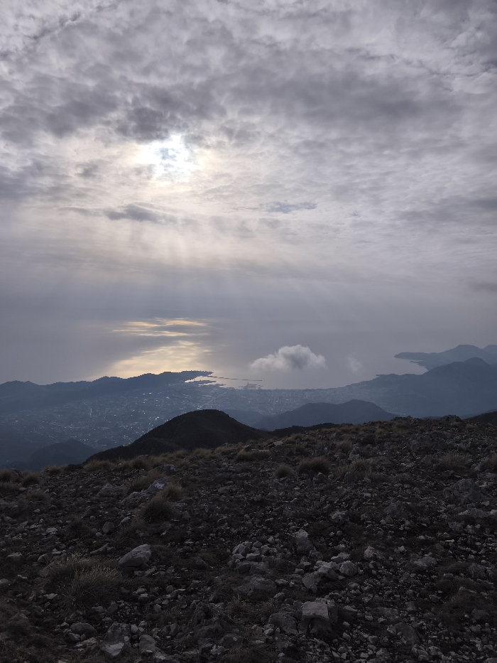 The image depicts a vast landscape observed from a high vantage point in Mali Mikulići, Montenegro. The immediate foreground consists of a rocky, uneven terrain covered with dark grey stones and sparse patches of dried, yellowish-brown grass. Beyond this rocky expanse, a series of darker mountain ridges descend towards a coastal plain. A densely populated urban area, characterized by numerous buildings, occupies the mid-ground, bordering a large body of water. A prominent port or harbor with visible piers extends into this body of water. The water's surface displays a distinct, elongated reflection of bright light, originating from a partially obscured sun positioned in the upper-left quadrant of the overcast sky. The sky itself is covered by a thick layer of grey clouds, with visible rays of light piercing through the cloud cover and illuminating sections of the sky and water. A single, isolated white cloud floats above the water to the right of the primary sun reflection. In the distant background to the right, additional mountainous landforms frame another inlet or bay. No human figures or discernible actions are present within the scene.