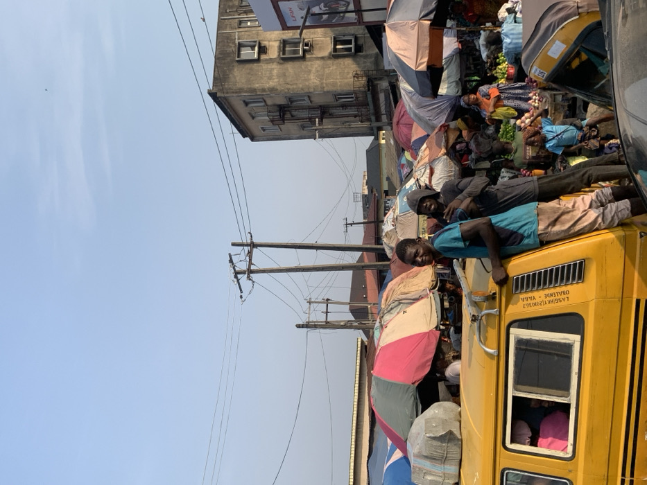 A bustling outdoor market scene in Africa with vendors, goods, and people. A yellow bus is visible in the foreground with two men lying on its roof. An old, multi-story building is in the background alongside utility poles and wires. Colorful umbrellas are used to shield vendors from the sun. A variety of produce and other items are on display. The scene is crowded and vibrant.