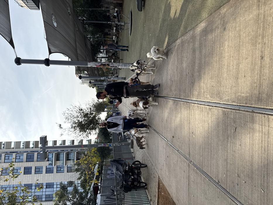 The image depicts an outdoor urban environment, specifically a park or promenade in Tel-Aviv, Israel, under clear daylight conditions. Two adult males are walking along a concrete pathway featuring two parallel recessed metal tracks. The male on the left, wearing a light-colored hooded sweatshirt and dark pants, manages at least three leashed dogs. The male on the right, in a dark long-sleeved shirt and cargo pants with a fanny pack, is gesturing with his right hand while controlling a larger group of approximately nine leashed dogs. The dogs, varying in size, breed, and coloration (including a small white fluffy dog, a white dog with black spots, and several medium-sized brown and white dogs), are all moving in the same direction. In the left background, a modern, multi-story building with numerous windows and balconies rises. A metal fence runs along the left side of the pathway, behind which a three-wheeled cargo bicycle, covered by a dark tarp, is parked. Trees with green and autumnal foliage are visible behind the fence and within the park. To the right of the pathway, a grassy area extends, covered partly by large grey fabric awnings supported by dark metal pillars. Multiple indistinct figures are present in the shaded grassy area, including one male standing closer to the foreground, observing the dog walkers. The sky is light blue with a faint contrail, and sunlight casts shadows from the left side of the frame.