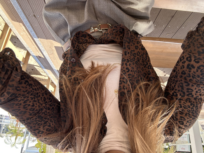 The image presents a close-up, chest-down view of an individual seated outdoors in Levallois-Perret, France. The person wears an unbuttoned brown and black leopard-print shirt over a light beige turtleneck top. Grey pleated trousers are visible below the waist, secured by a thin brown leather belt with a gold-colored buckle featuring a horse-head design. A delicate gold chain necklace with a small circular gold pendant is visible on the turtleneck. Long, reddish-brown hair cascades over the individual's shoulders and chest. The subject is seated on a light brown wooden slatted bench, with a similar wooden deck interspersed with metallic strips visible on the ground. The background, under clear daylight, shows green foliage, including elements resembling palm trees, and parts of modern structures, one with a white sign displaying red letters, possibly "HLN."