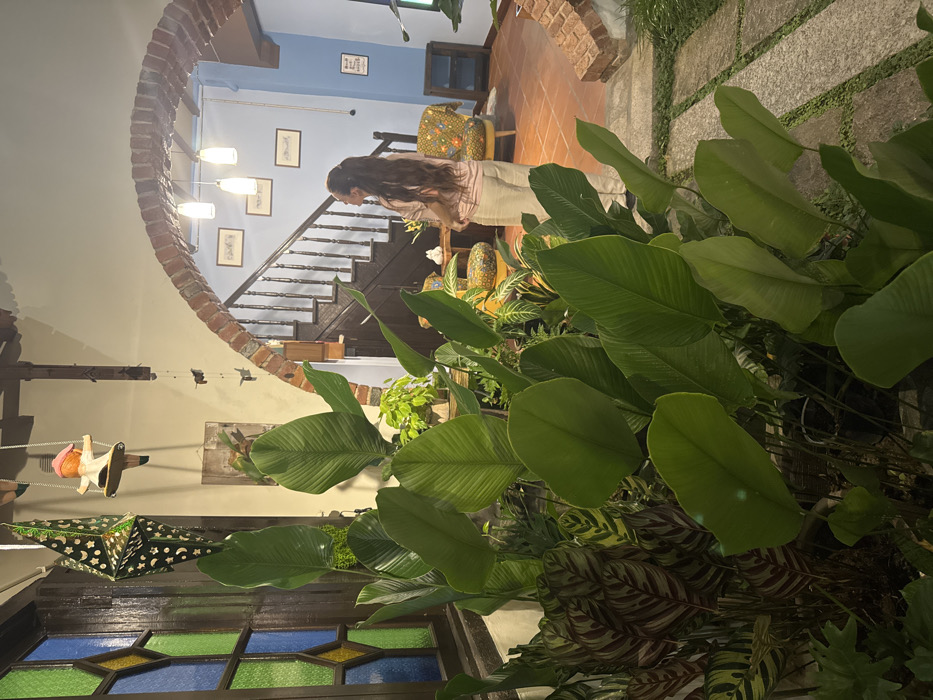 The scene depicts an interior space within George Town, Malaysia, characterized by lush indoor plants and traditional architectural elements. In the foreground, a dense collection of tropical plants fills the lower left and central frame. These include large, paddle-shaped green leaves (possibly from a species like *Calathea lutea*) and plants with variegated leaves displaying dark reddish-brown stripes on a green background (e.g., *Calathea 'Dottie'*). A path composed of irregularly shaped grey stone pavers with visible grout or ground cover extends from the lower right towards the midground. In the midground, a female individual stands on the stone path, facing away from the camera and towards the background. She has long, dark hair, partially gathered, and is wearing a light-colored, short-sleeved top and light-colored, wide-legged trousers. To her left, a dark wooden window frame contains multiple panes of stained glass in green, blue, yellow, and brown. Above the plants on the left, a dark, star-shaped lantern with cutout patterns and a small figurine of a child wearing a pink hat, suspended on a swing, hang from an overhead wooden beam. An archway constructed from exposed red bricks spans the central space, delineating the midground from the background. The background, visible through and beyond the archway, features a floor covered in terracotta tiles. A dark wooden staircase with balusters ascends along a light blue wall. Three framed pictures are affixed to this light blue wall. Below the pictures, two armchairs upholstered in a yellow fabric with dark patterns face each other, flanking a small, light-colored wooden table that holds a white decorative object. Three pendant lights with clear glass shades and visible bulbs hang from the ceiling within the archway. A dark wooden cabinet or shelf is partially visible on the far right. The entire scene is illuminated by interior artificial lighting.