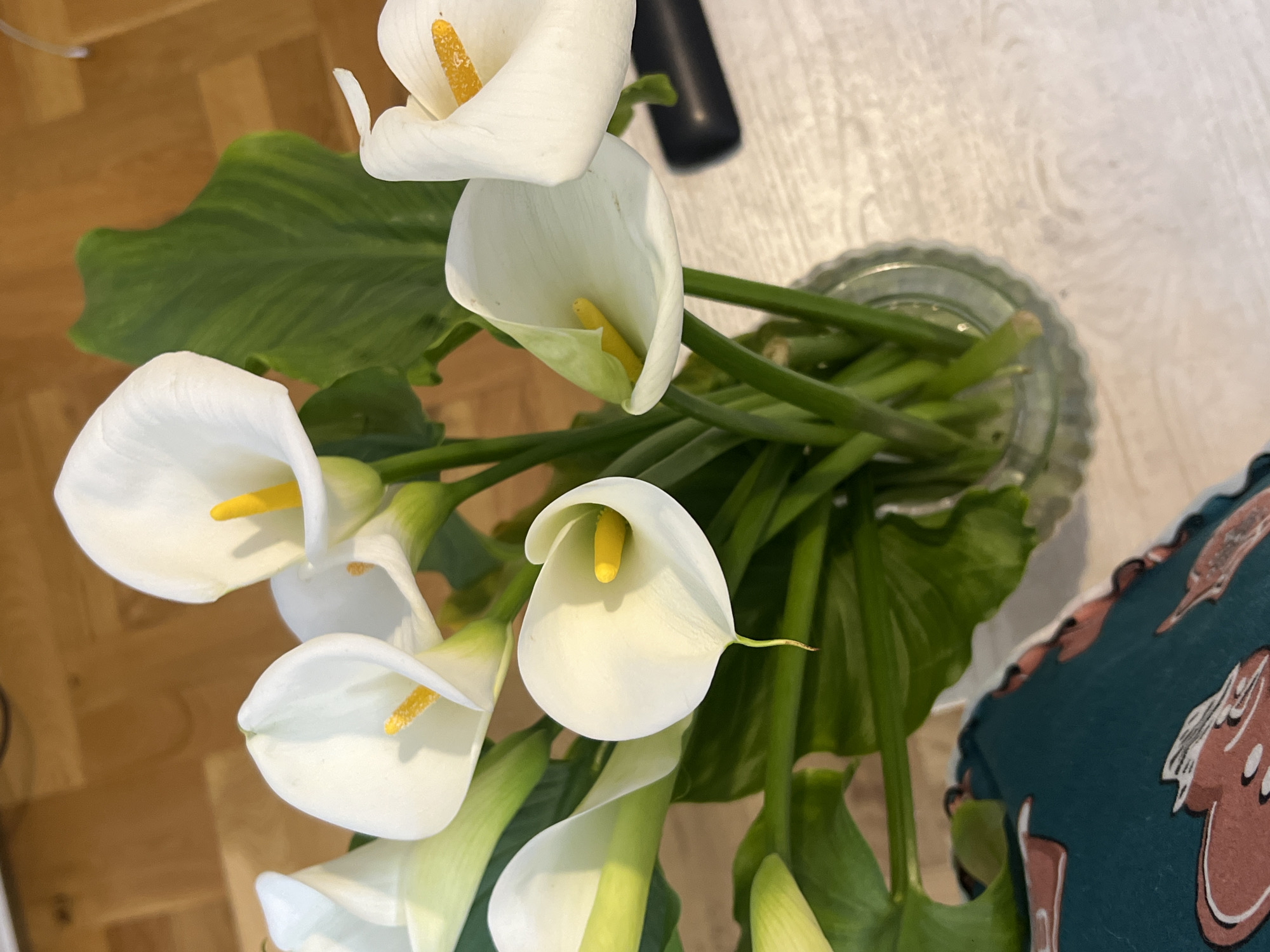 - "A vertical photograph depicts a bouquet of white Calla Lilies (Zantedeschia aethiopica) contained within a clear, fluted glass vase filled with water" by FM-CMDbi2, licensed under CC BY 4.0
