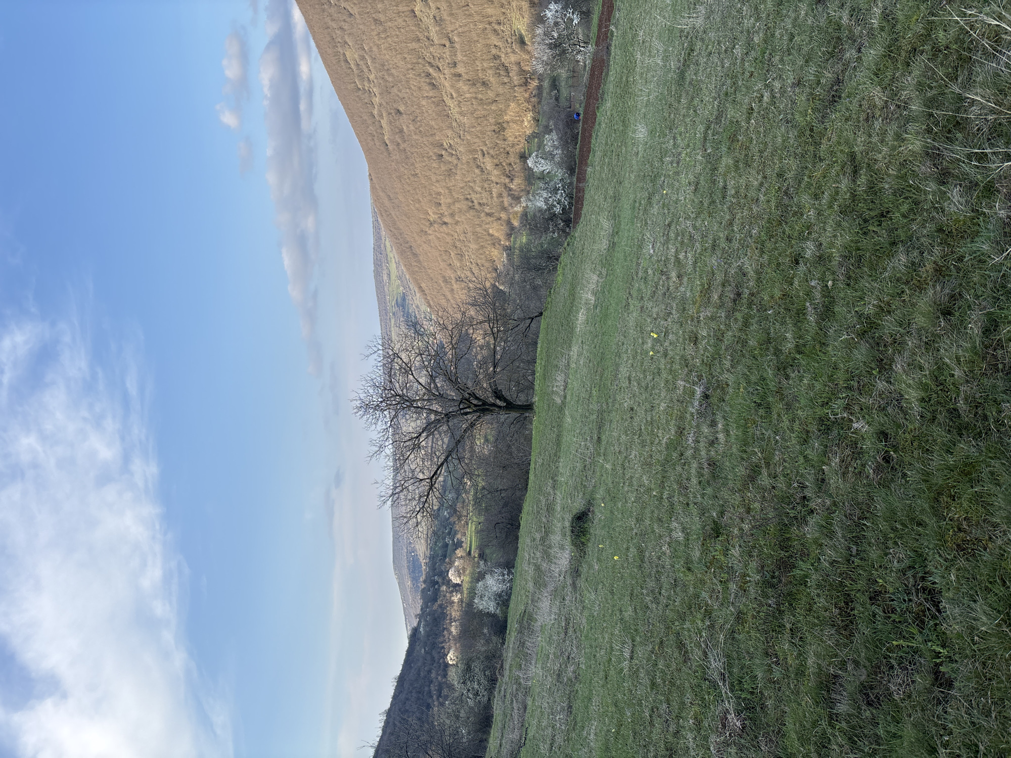 landscape in Galata, Bulgaria. A grassy hillside slopes upward from the bottom right to the center. A bare tree stands on the hillside, and beyond it, a valley with trees and some blooming white trees are visible. In the background, a steep hill covered with brown vegetation rises. A blue sky with scattered clouds is visible in the upper left. A walking path is visible on the hill above the hillside. A blue person can be seen on this path.