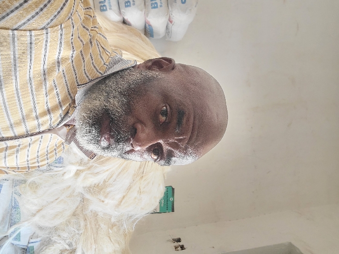 An adult male, appearing to be of African descent, with a bald head and a prominent grey beard, is depicted in a medium close-up, facing the camera directly. He wears a yellow and white horizontally striped collared shirt. The background features a stack of white bags with blue lettering, possibly "Bua Special," on the left. To the right, a large, voluminous pile of light-colored, raw fibrous material is present. The indoor setting consists of plain, light-colored walls, showing some discoloration. The scene is located in Maiburiji, Nigeria.