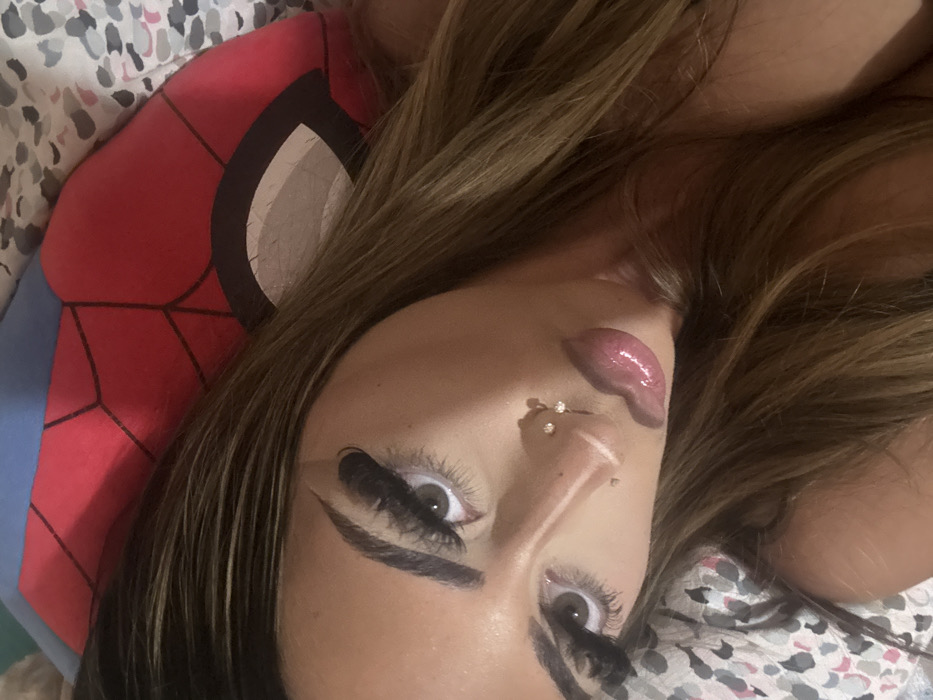 A woman lies on her side with her head tilted towards the camera. She has brown hair, dramatic eye makeup, and a nose piercing. The background features bedding with a scattered pattern and a Spider-Man pillow. She has glossy lips and is posing in a casual manner.
