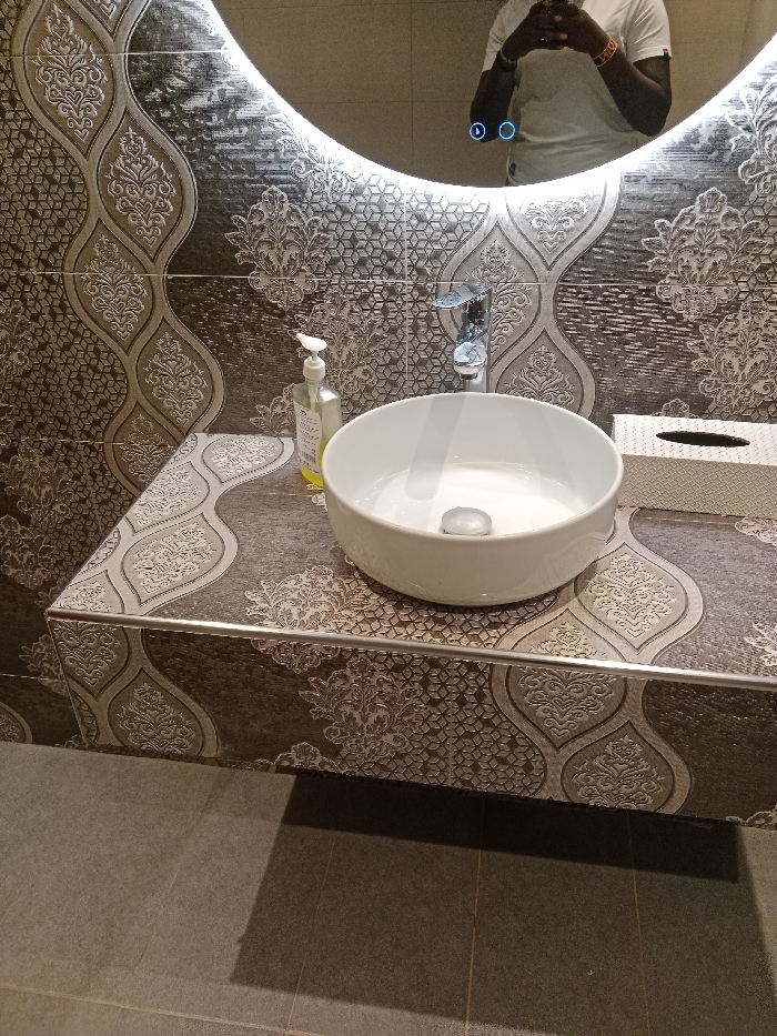 bathroom sink with a white porcelain basin and a chrome faucet. The sink is mounted on a countertop that has a brown and silver patterned tile surface. There is a dispenser of liquid soap next to the sink and a white tissue box on the countertop. The background shows a round, illuminated mirror with an ornate tiled border. The bathroom floor has brown tiles. The location is Unknown, Unknown, based on coordinates (latitude: 666, longitude: 666).