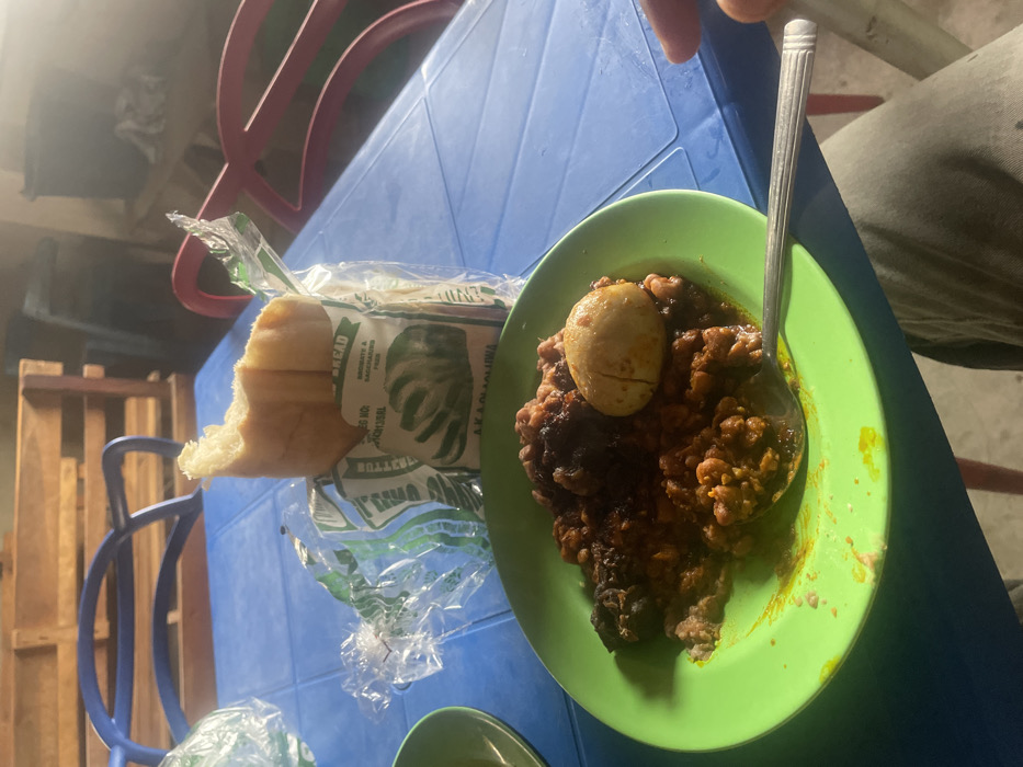 The image displays a meal set on a blue plastic table within an unspecified casual indoor or outdoor environment in the city of Unknown, Unknown. A green plastic plate, centered in the foreground, contains a stew-like dish composed of reddish-brown beans, darker solid components, and one hard-boiled egg, halved to expose its yellow yolk. A silver spoon rests within the dish. To the upper right, a white bread loaf, with a portion bitten off, is enclosed in a clear plastic bag bearing green and white branding that includes the word "BREAD" and what appears to be "AKAOLUWA," along with an illustration of sliced bread. A second, empty green plastic plate is partially visible on the far left. The lower right corner reveals a person's right leg, clad in light-colored trousers, and the edge of a finger resting on the table. The background features parts of a blue plastic chair and a red plastic chair, a wooden slatted structure, a dark container, and draped white fabric. Bright sunlight illuminates the scene from the right.