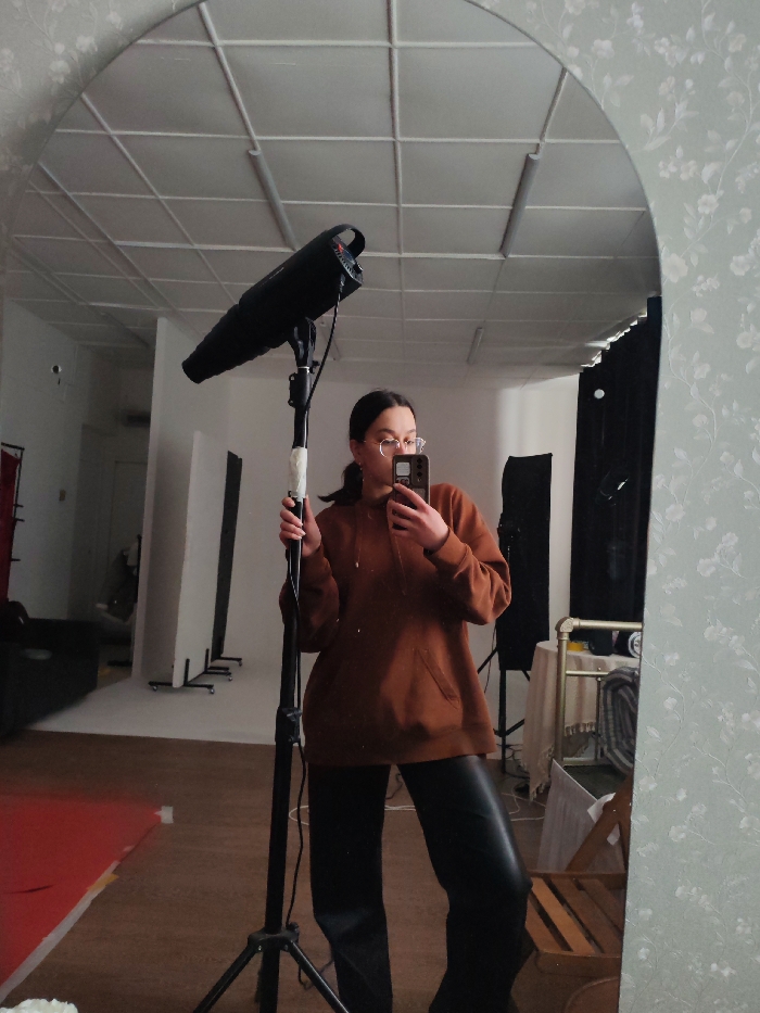 The image captures a selfie reflection in a large, arched mirror, depicting an indoor scene identified as a photography studio in Unknown, Unknown