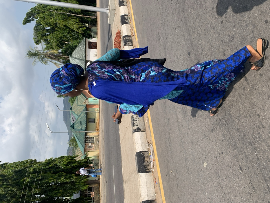 A female individual is observed walking forward on an asphalt road in Zango-ndaji, Nigeria, with her right side partially visible and facing away from the camera