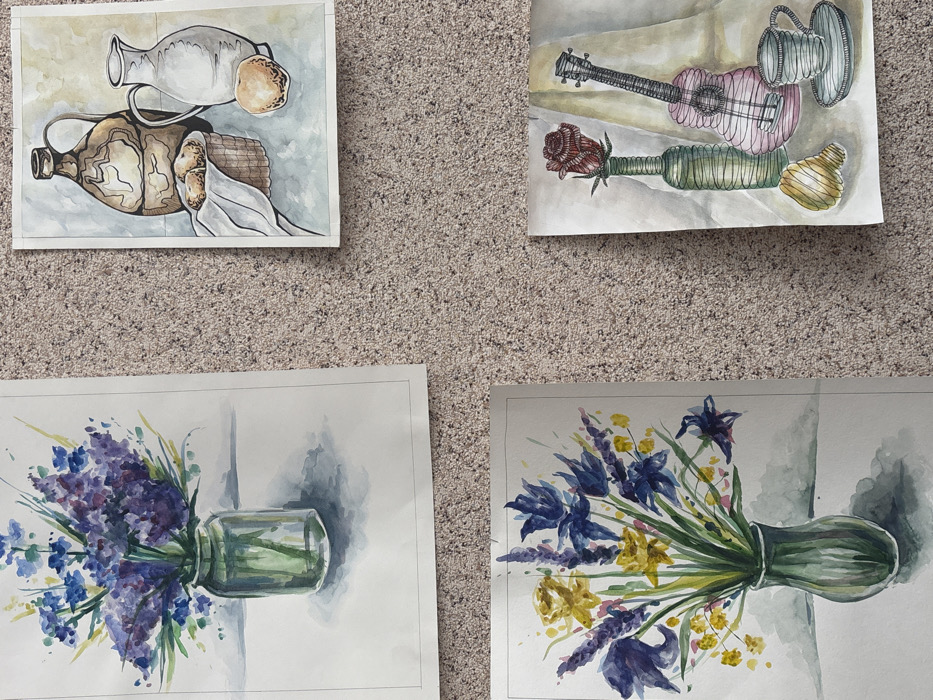 The scene displays four watercolor paintings laid out on a light brown, speckled, low-pile carpet, presumably in the city of Tayshet, Russia. No people are visible. The top-left painting depicts a still life featuring a bouquet of purple and blue flowers, possibly lilacs and delphiniums, arranged in a clear glass jar with a slender neck. The jar sits on a white surface, casting a light shadow to its right. The top-right painting is a still life that includes two pitchers: one larger, light brown with dark contours, and a smaller, white pitcher. Between them is a wicker basket containing several light-colored baked goods, draped with a white cloth. A light-colored fruit, resembling an apple or peach, rests to the right of the white pitcher. The items are placed on a light blue-grey surface. The bottom-left painting presents another still life of a floral arrangement. This bouquet consists of yellow flowers, likely daffodils or mimosa, mixed with purple and blue irises or lupins. These flowers are contained within a green, ribbed vase, situated on a white surface with a shadow extending to the right. The bottom-right painting is a stylized still life. It features a deep red rose with prominent petals, set in a tall, green, bottle-shaped vase with a textured, possibly wire-wrapped appearance. To its right is a pink ukulele, also depicted with a similar wire-frame or textured effect. A white teacup and saucer, bearing the same textured rendering, are positioned in the foreground. These objects rest on a light-colored surface, backed by a draped light-colored fabric. All four paintings are rectangular, oriented vertically, and appear to be unframed, directly placed on the carpeted floor. The ambient lighting illuminates the scene uniformly.