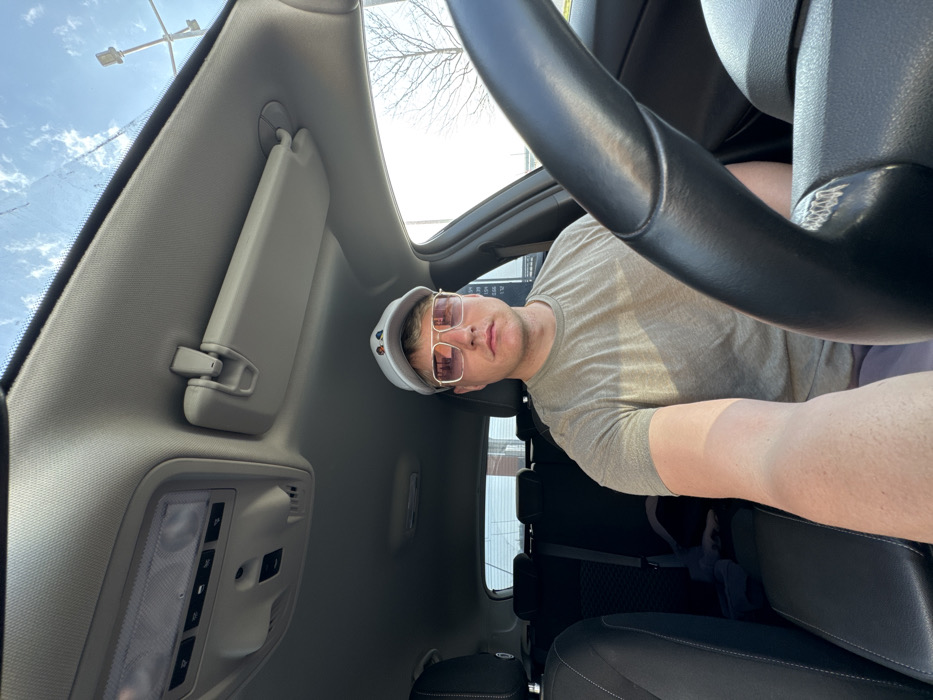 An image taken from within the driver's seat of a stationary passenger vehicle depicts an adult male
