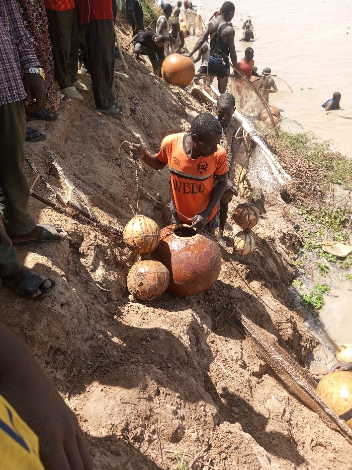 The image displays a scene on a sloping, light brown sandy bank adjacent to a murky body of water in Kokani North, Nigeria. In the central foreground, a dark-skinned male wearing an orange t-shirt with "WELL" printed on it holds a rope connected to a light brown spherical object, which appears to be a gourd or a float. This individual is positioned near a large, reddish-brown clay pot and two additional similar spherical objects resting on the sand. Behind him and to the right, another individual is partially visible. Further up the bank and extending into the background, multiple other dark-skinned individuals are present. Some are standing on the eroded sandy incline, while others are partially submerged in the light brown water, engaged in activities involving fishing nets or traps. A large, conical-shaped fishing net structure is visible on the bank in the mid-ground. Additional light brown spherical objects, consistent with gourds or floats, are scattered on the bank near the water's edge. The water itself contains sparse green aquatic vegetation along the bank. The lighting suggests bright daylight, casting distinct shadows. Individuals are dressed in casual attire, including t-shirts, pants, and sandals; some in the water are shirtless.