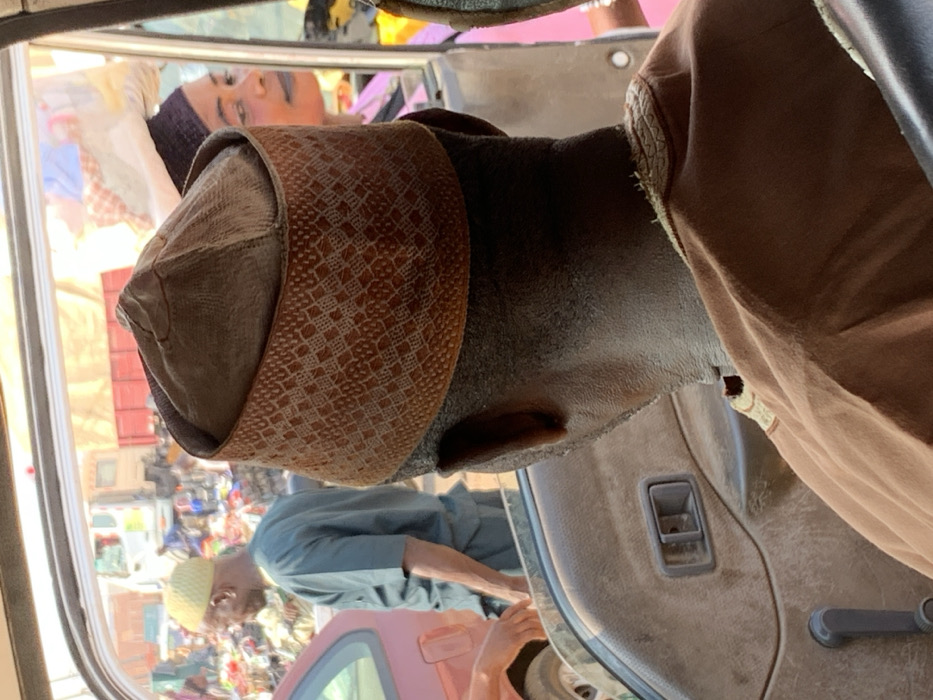 The image captures a bustling outdoor market scene in Oyo, Nigeria, viewed from inside a vehicle. In the foreground, the back of a dark-skinned individual is visible, wearing a brown, peaked cap with a light-brown geometric pattern on its band, and a brown garment with light-colored embroidery visible at the neckline. To their left, the vehicle's dusty tan door panel features a grey interior door handle and window crank. Through the vehicle's window, a market environment unfolds under bright daylight. On the left, a dark-skinned man wearing a short-sleeved teal shirt and a light yellow skullcap is seen walking, facing away from the camera's perspective, past the rear of a red vehicle. Behind him are indistinct piles of merchandise. On the right, a dark-skinned woman with dark lipstick and a dark head covering is partially visible, carrying items (possibly wrapped in a light-colored cloth or plastic) balanced on her head. She faces slightly towards the left, looking into the distance or at the passing activity. The background indicates a busy, potentially congested, urban market setting.