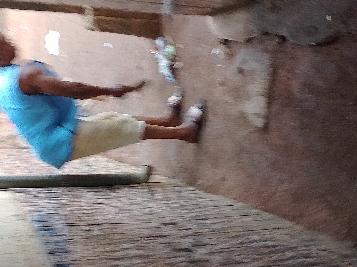 A blurry, sideways view shows a person with tan shorts and a blue tank top, facing left. Their arms are extended, and they're wearing sandals. The background is a wooden wall, with some objects hanging or attached. The floor appears to be made of planks. A gray pipe runs parallel to the floor near the bottom of the image. The overall scene is somewhat distorted and unclear due to the blur.