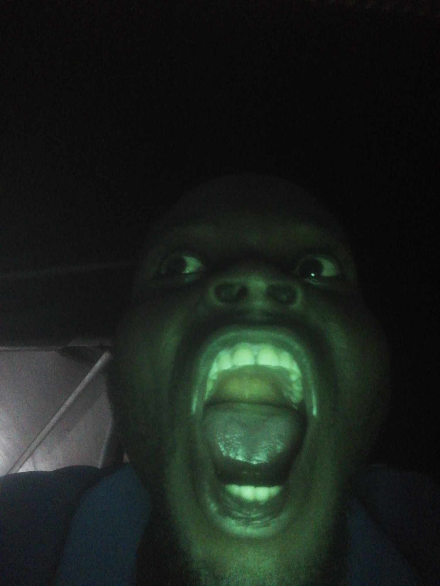 A close-up photograph depicts a dark-skinned person, presumably male, with their mouth wide open in what appears to be a scream or yell. The teeth and tongue are visible, illuminated by a greenish light source. The background is predominantly dark, but a lighter, possibly white, surface is visible in the upper left corner. The location is Ikorodu, Nigeria.