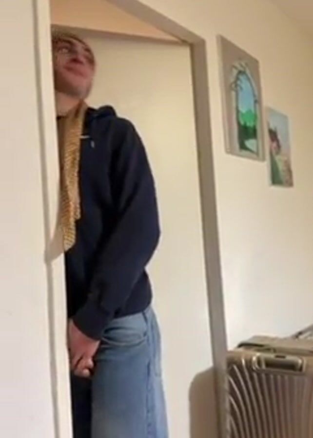 A person wearing a navy blue hoodie, blue jeans, and a scarf stands in a doorway, their face obscured by the doorframe. A suitcase is visible to the right. A young woman in a gray sweater and plaid pants dances in a living room. The room contains a TV with a show playing on it, a wooden TV stand, a clock on the wall, a baby's highchair, and a closed white door. The scarf-wearing person watches her dancing.
