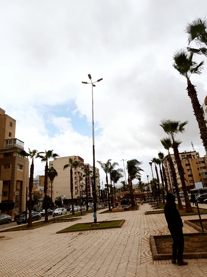 The image depicts a broad urban thoroughfare in Meknes, Morocco, characterized by a wide, central pedestrian promenade paved with light-toned, interlocking paver stones in a repeating pattern. This promenade is flanked by rectangular raised planters containing numerous tall palm trees and minimal green shrubbery. A prominent, very tall streetlamp with four top-mounted luminaires stands in the central-left portion of the frame, reaching towards a sky that is predominantly overcast with visible patches of blue. Multi-story buildings, ranging from four to eight floors in height, line both sides of the street, exhibiting various architectural details including windows and balconies, suggesting a mixed-use or residential urban environment. On the roads adjacent to the central promenade, multiple vehicles, including parked and moving cars of various colors (silver, white, black), are visible. In the immediate foreground on the right, a single individual is partially observed from the waist down, silhouetted in dark clothing and brown shoes, standing on the edge of a planter box and facing away from the camera, looking down the paved path. Several other indistinct human figures are present in the distant background, indicating general pedestrian activity.