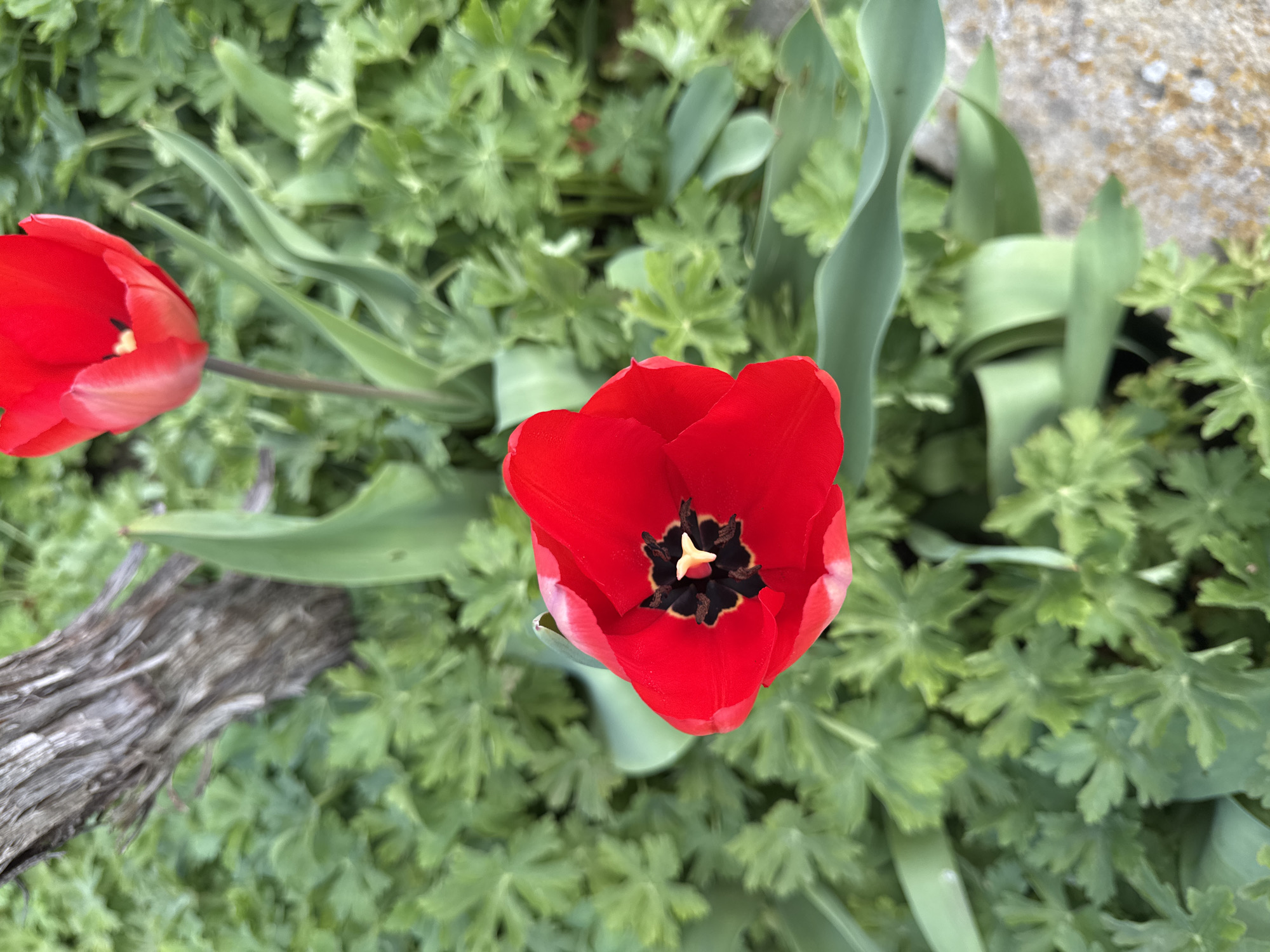 A close-up, high-angle shot shows two red tulip flowers in bloom against a backdrop of dense green foliage. The foreground flower is fully open, revealing a black center with a yellow stamen. The other flower is partially visible in the top left. The background vegetation appears to be a mix of small, leafy plants. A piece of dried wood lies near the left edge of the frame. The location is Byala Cherkva, Bulgaria.