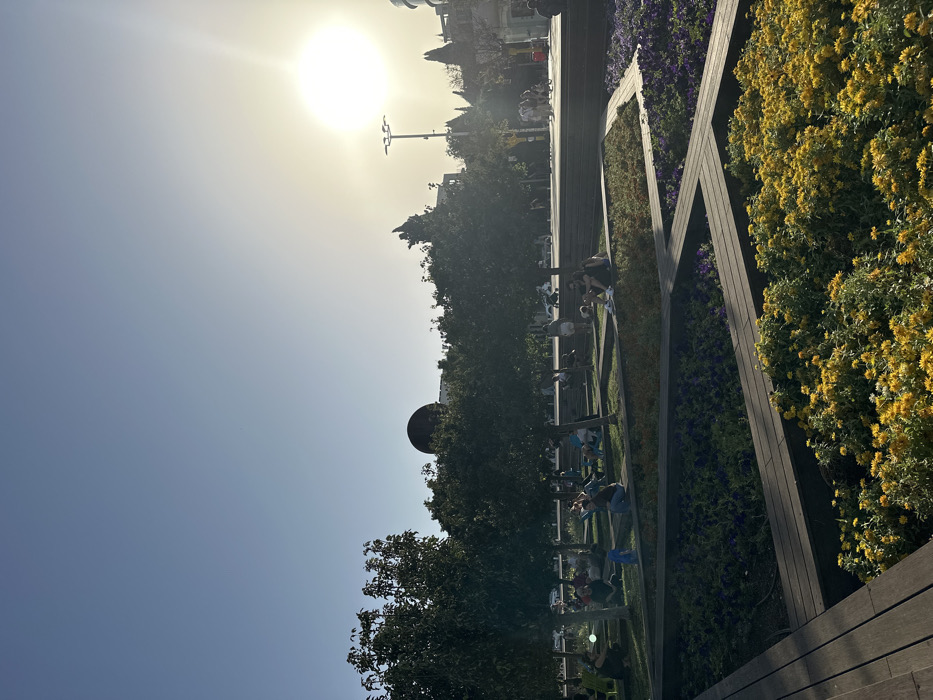 The image depicts a bright, sunny outdoor scene at Kikar Ha-Medina in Tel Aviv, Israel, characterized by a low sun in the upper right causing significant lens flare. In the foreground, geometrically arranged raised planters with dark wooden borders contain beds of yellow flowers (lower left) and purple flowers (middle right). The midground features a terraced lawn area with small, leafy trees providing shade. Approximately 15-20 individuals or small groups are scattered across this grassy area, sitting or reclining on the grass and wooden edges, engaged in leisure activities. One person is distinctly visible near a blue object. In the background, a paved pedestrian area with additional individuals strolling is present. Above the treeline on the left, a large, dark, spherical sculpture, "The Sphere" by Menashe Kadishman, is partially visible. On the right, a tall, multi-headed street light is silhouetted against the intense sunlight. The sky is clear, transitioning from light blue at the top to a bright white-yellow near the sun.