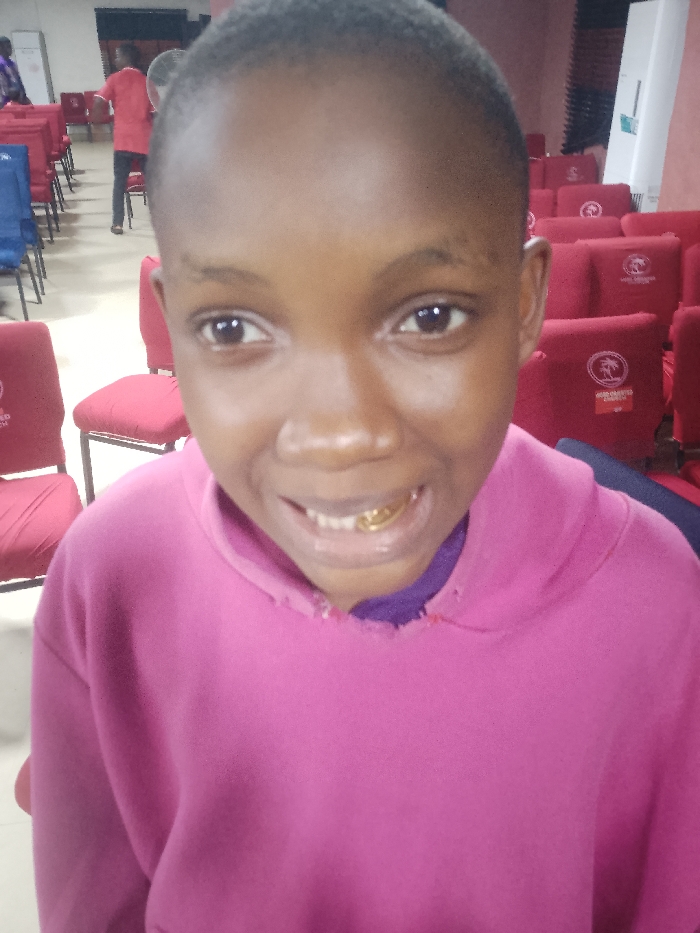 An indoor, eye-level portrait shows a young individual, likely a child, with dark skin and closely cropped hair, directly facing the camera and smiling