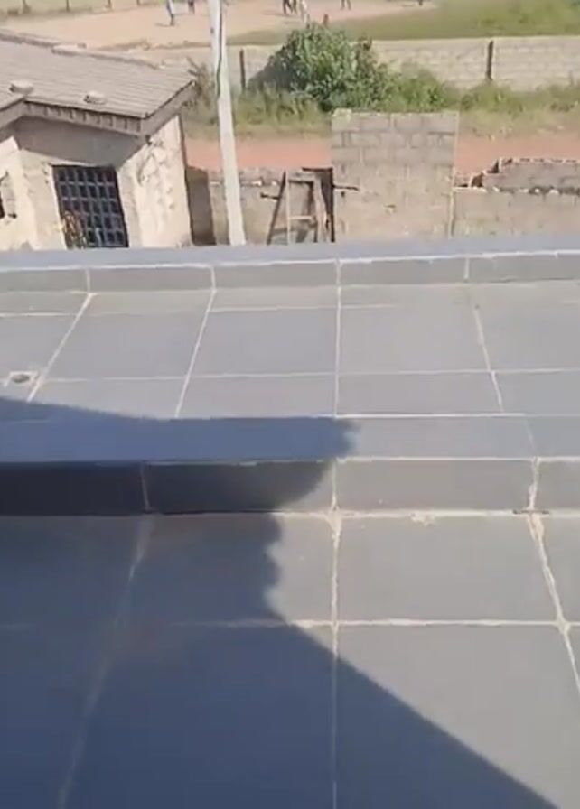 From an elevated position, possibly a rooftop, a video pans across a residential landscape under a clear blue sky. The foreground features tiled rooftops of varying shades, interspersed with a building constructed of concrete blocks. Beyond the buildings lies a dirt field where several individuals appear to be playing, perhaps a game of soccer. The backdrop encompasses more houses and buildings, extending into the horizon, where a distant cityscape is discernible. Power lines and utility poles dot the scene, adding to the overall view of a suburban setting.