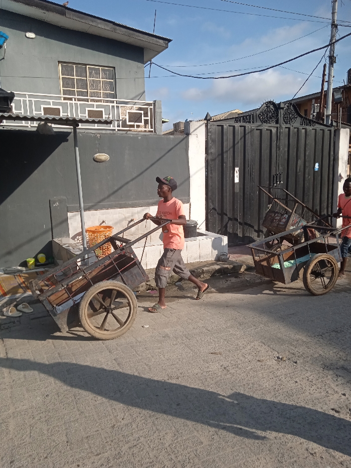 - "The scene in Agani, Nigeria, depicts two young males pushing metal handcarts along a paved street during daylight hours" by FM-okTjp1, licensed under CC BY 4.0