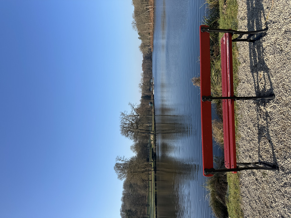 The image depicts a static, panoramic outdoor scene at Lac de Cernay in Cernay-la-Ville, France, under a clear blue sky. In the immediate foreground, a vacant red wooden park bench with black cast-iron supports is positioned on a light gray gravel path. The bench faces the lake, with its back to the viewer. Adjacent to the gravel path and in front of the bench, a strip of sparse, frosted green and brown vegetation separates the path from the water's edge. The midground is dominated by the calm, dark blue surface of Lac de Cernay, which exhibits subtle ripples and reflections of the surrounding landscape. On the far left bank of the lake, partially submerged, is a small, dark structure resembling a low bridge or pier. Further along the left bank, a verdant grassy area is visible, interspersed with numerous deciduous trees that appear to be bare of foliage, suggesting a winter or early spring season. Small dark specks, consistent with waterfowl, are present on the water's surface in this area. Towards the right side of the lake, a series of small, light-colored structures, possibly boathouses or docks, are visible along the shoreline. The distant background on both sides of the lake consists of dense natural woodland, primarily composed of bare deciduous trees, with some evergreen trees interspersed. The trees line the entire horizon of the lake. The upper two-thirds of the image display an unblemished, vibrant blue sky. Sunlight is prominent, casting defined shadows from the bench onto the gravel path, indicating a bright, clear day. No individuals or active subjects are present in the scene.