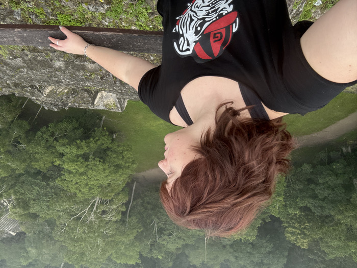 An adult female is depicted in an elevated, outdoor setting, likely atop an ancient stone pyramid or temple within Tikal National Park, near Flores, Guatemala. The subject, viewed from the upper torso, has reddish-brown, wavy hair and wears a black t-shirt with a white and black graphic of an animal wearing a red cap marked with a white "G". A black undergarment is visible beneath the t-shirt. She wears a silver-colored bracelet on her left wrist and a silver-colored ring on her left ring finger. Her right forearm rests on a weathered wooden railing situated at the edge of a gray, moss-covered stone structure. The subject's head is turned to the right, observing the distant landscape. The background reveals a vast expanse of dense green jungle canopy, with a winding dirt path, grassy clearings, and the partially visible upper sections of other stone structures integrated into the forest below. The sky overhead appears overcast or hazy.