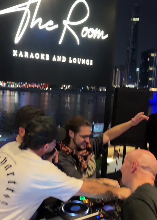 group of four men at night at "The Room, Karaoke and Lounge," with city lights and a river visible in the background. One man is operating a Pioneer DJ setup, wearing glasses and a patterned scarf. Two men are attempting to sing into a microphone, one wearing a white shirt with writing and a black baseball cap, the other a blue t-shirt. The fourth man, bald, stands beside the DJ setup. All of them are interacting closely with the DJ, reaching for the equipment and laughing. The scene appears lively and social.