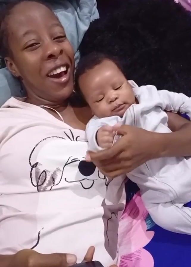 A woman is lying on a bed, holding a baby in her arms