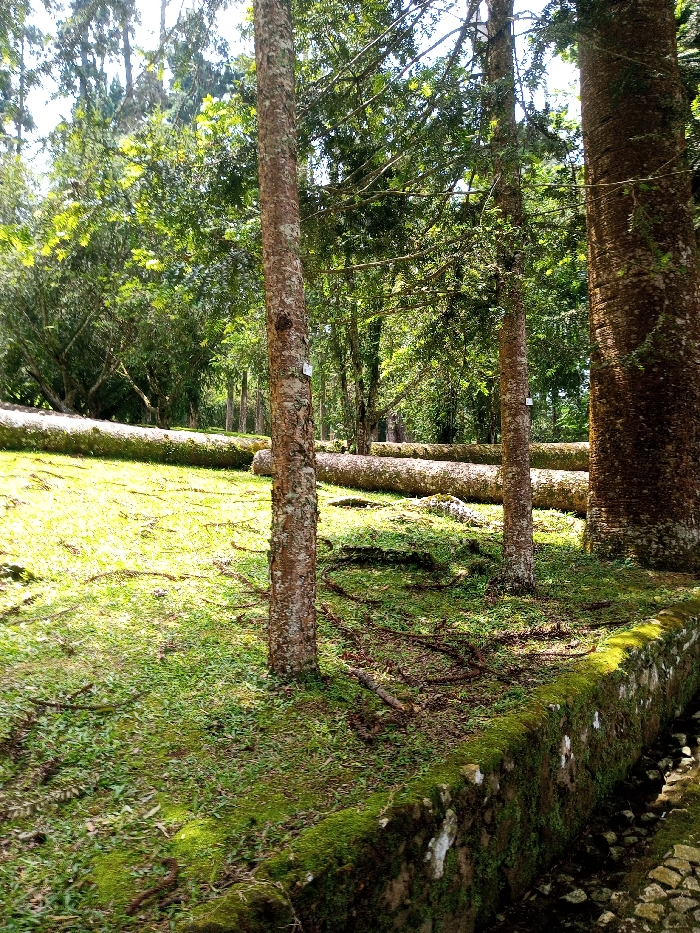 A bright, sun-drenched glade with several slender trees in the foreground. A mossy stone wall defines the edge of the area. Sunlight dapples the grassy ground, creating shadows and highlights. Behind the slender trees, a series of long, cylindrical objects stretch across the glade, appearing like fallen logs. Lush green foliage and taller trees form a dense backdrop, suggesting a forest setting.