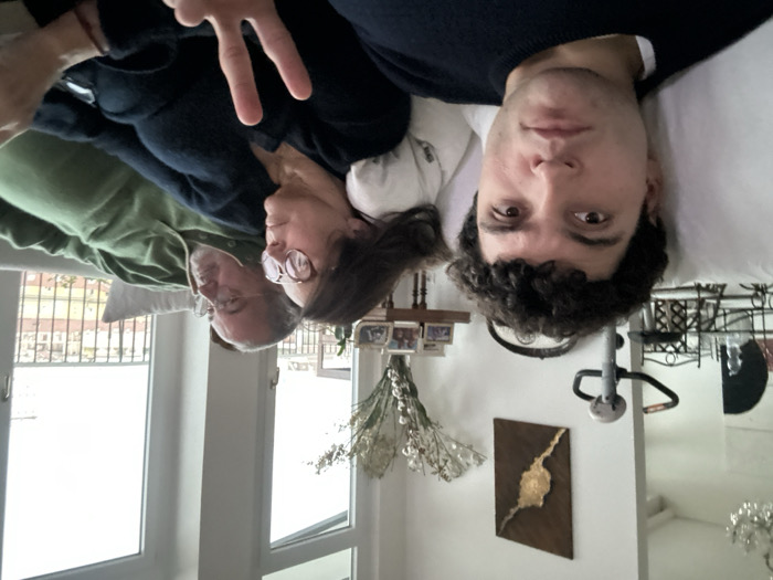 An indoor photograph shows three individuals seated on a light-colored sofa in a residential setting in Milan, Italy