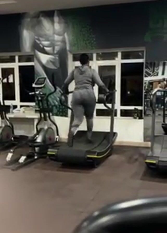 woman working out on a treadmill in a gym. The woman is wearing a gray tracksuit and has her back to the camera. She is holding onto the handrails of the treadmill while walking at a moderate pace. The gym has multiple pieces of exercise equipment, including elliptical machines and treadmills. A mural of a muscular torso is on the wall behind the woman, along with a logo in the top right corner. There are windows in the back. The gym has a dark brown floor.