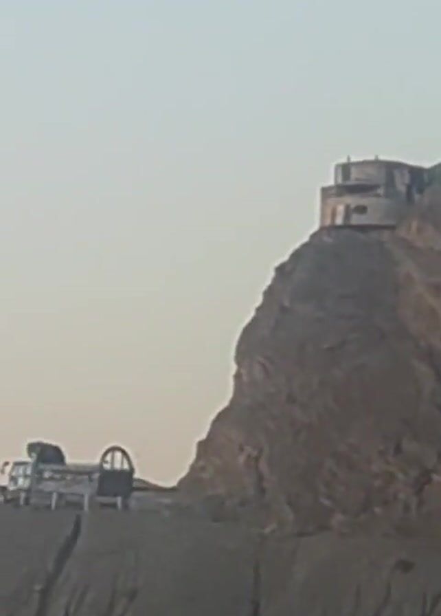 mountain range with a building on top of one of the peaks. A road runs along the side of the mountain, and a truck and a car can be seen driving on it. The landscape is barren and rocky, and the sky is a pale grey. The camera moves slightly during the video.