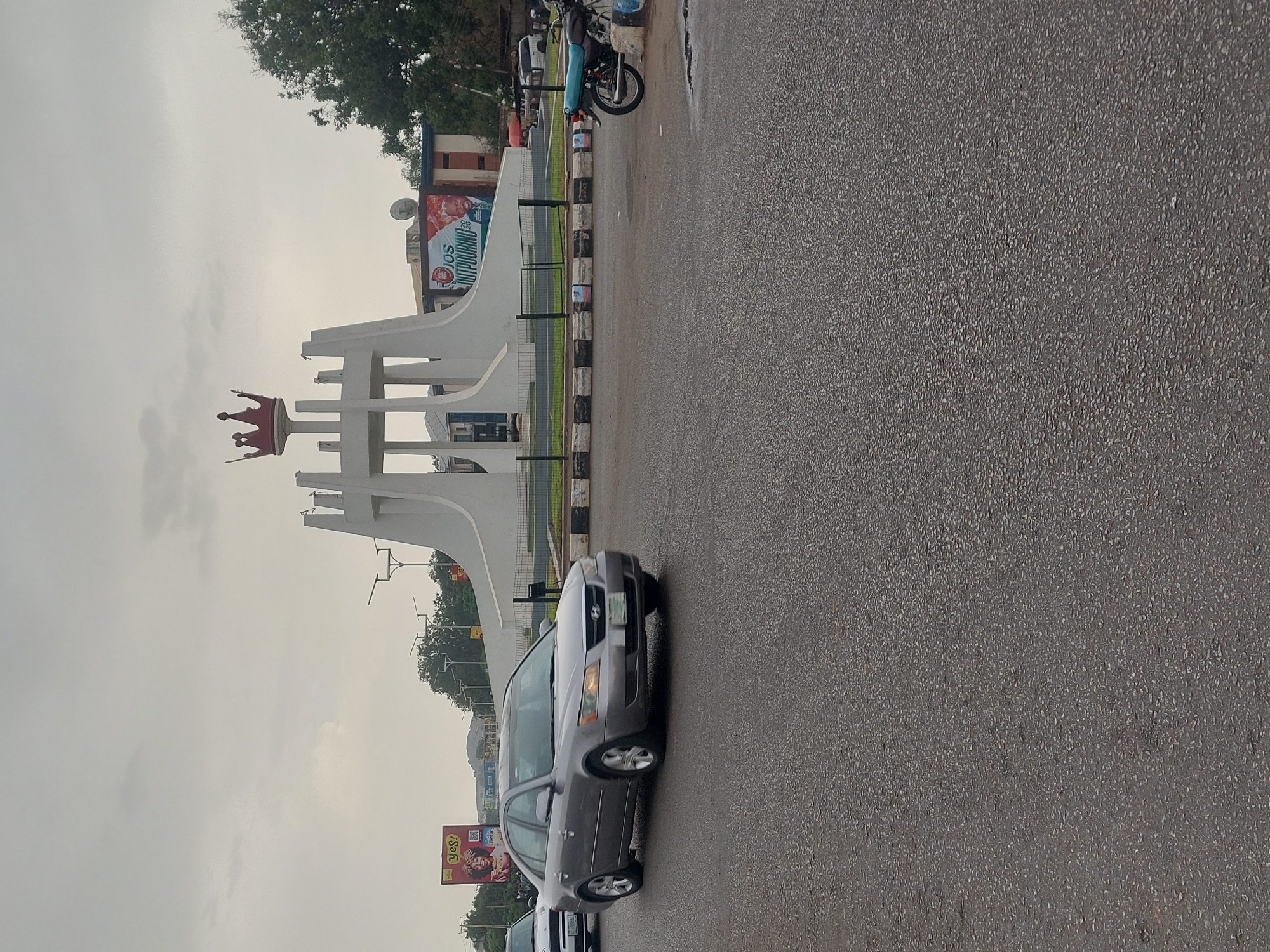 street scene in Jos, Nigeria, featuring the "Tin City" monument. The monument is a white, multi-columned structure topped with a red crown, positioned on a traffic island. The sky is overcast, suggesting a recent or ongoing rainfall, reflected on the wet asphalt road. Several cars, including a gray sedan prominently in the foreground, are present on the road. A billboard with advertising is visible on the left side of the frame. Also present is a motor bike on the right, parked behind the monument.