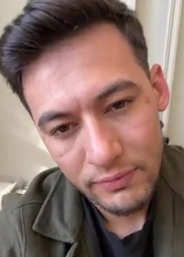 A man with short brown hair and a light beard is looking down at the camera. He is wearing a dark t-shirt and an olive-green jacket. The background consists of a white wall and a partial view of a white doorframe. The lighting is soft and even. The man's gaze shifts slightly upwards during the video.