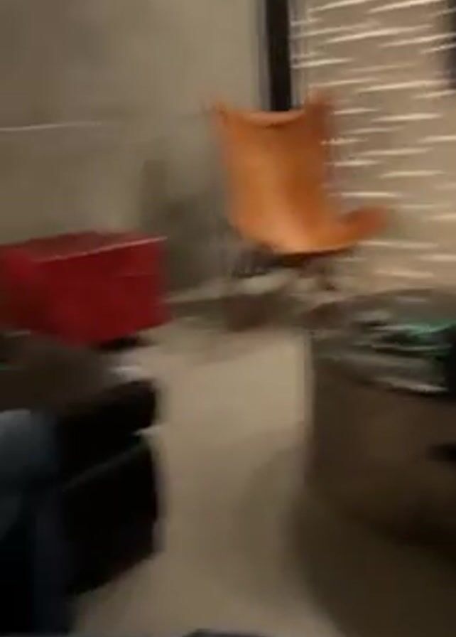 n interior space with several people present. In the first frame, a man is sitting in a wooden framed chair looking at his phone. There are two stacked round tables nearby, holding various containers, including a black tumbler and a blue water bottle. Behind him is a textured wall with a large black screen mounted on it. The camera then shifts to a view of two people reclining on a dark-colored couch, partially obscuring each other. An air conditioning unit is visible on the wall above them.