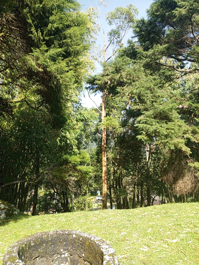 A dense forest view showcases varied tree types, including bamboo on the left and tall, straight trees centrally. A weathered, moss-covered stone structure resides in the foreground, sitting on a grassy lawn. In the distance, nestled amongst the trees, glimpses of vehicles suggest a nearby road or developed area. The scene is bright, with daylight filtering through the canopy.