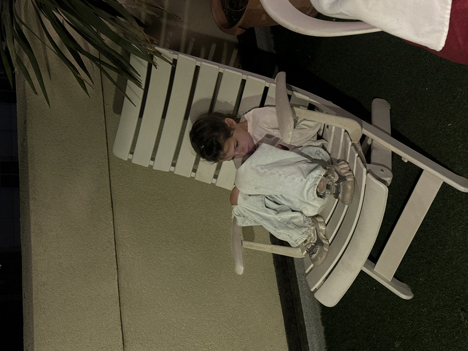 A child sits curled up in a white Adirondack chair. The child wears light-wash jeans, a light-colored top, and sandals. A potted plant sits nearby, and the chair is situated on what appears to be artificial grass. A building wall is visible in the background next to a large palm frond.