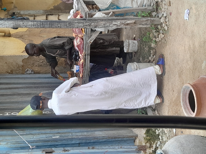 In Hotoro North, Nigeria, an outdoor market scene depicts a meat vendor preparing food for a customer