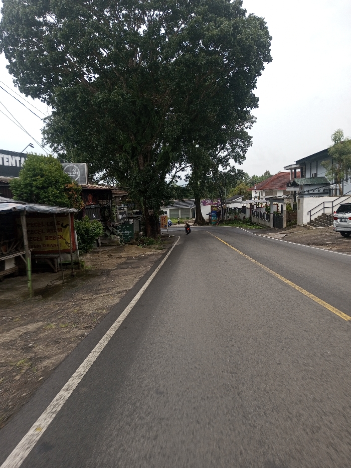 The image depicts a street scene in the city of Kamji Na-Yekha, Bhutan, under an overcast sky. A two-lane asphalt road with a solid white line on the left edge and a solid yellow line near the center extends from the foreground into the distance. On the left side of the road, an unpaved shoulder borders several rustic, possibly commercial, structures. One structure features a prominent sign displaying "PECEL LELE," "PECEL AYAM," and "PECEL BEBEK." Dense, mature trees with dark green foliage line this side of the road, their canopies extending high into the frame. Utility wires are visible above these structures and trees. In the mid-ground, a single individual wearing dark clothing and a helmet is operating a dark-colored motorcycle, traveling away from the camera on the right side of the road. The right side of the scene features a series of buildings, including multi-story structures with tiled and flat roofs, concrete fences, and visible external staircases. A silver sport utility vehicle is parked on the far right, partially visible. The overall environment suggests a semi-urban or suburban setting.