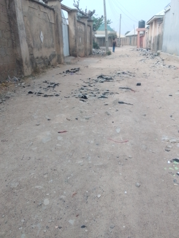 The image presents an unpaved residential street in Dabawa, Nigeria, under overcast daylight