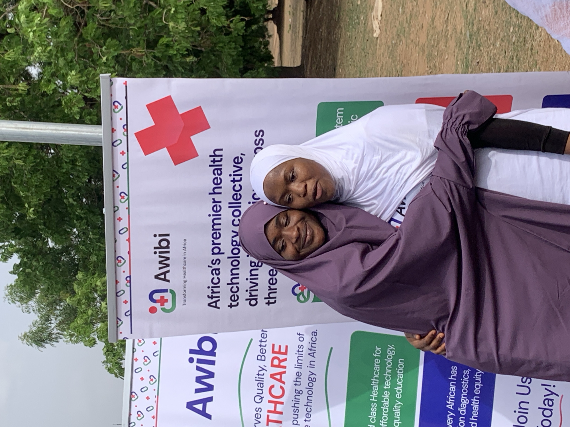 Two adult females are captured in an embrace outdoors, positioned in front of two large promotional banners. The individual on the left wears a deep purple hijab and garment, exhibiting a slight smile, with her right arm wrapped around the waist of the other female. The individual on the right wears a white hijab and garment, showing a neutral expression, with her left arm wrapped around the back of the first female. Both individuals appear to be of West African descent, with dark complexions. The banners in the background display the "Awibi" logo and text, identifying it as "Awibi Transforming Healthcare in Africa" and "Africa's premier health technology collective." The right banner also features a large red cross symbol. Further text on the banners includes phrases like "Serves Quality, Better HEALTHCARE," "pushing the limits of technology in Africa," "d class Healthcare for affordable technology, quality education," "every African has on diagnostics, d health equity," and "Join Us today!" The environment behind the banners consists of lush green tree foliage under a light gray, possibly overcast, sky. The ground visible to the right of the banners is unpaved earth. The scene is located in a public outdoor setting within the city of Unknown, Nigeria.