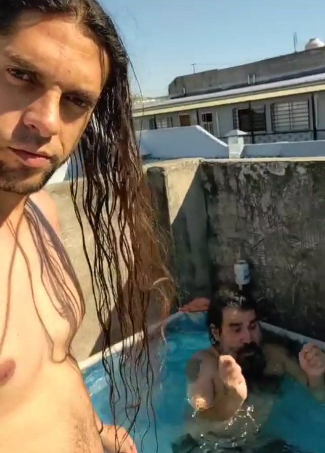 In a sunny outdoor setting, a bare-chested man with long, wet dark hair looks directly at the camera. He is standing near the edge of a small, inflatable pool filled with blue water. Another man, with a beard and wearing dark clothing, is sitting in the pool behind him. The pool is located on a concrete rooftop with a low wall surrounding it. There are buildings visible in the background against a clear blue sky. Loud music is playing in the background.
