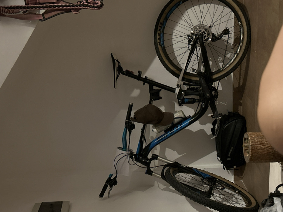 - "A black and blue mountain bike hangs upside down on a white wall" by FM-j80jY2, licensed under CC BY 4.0