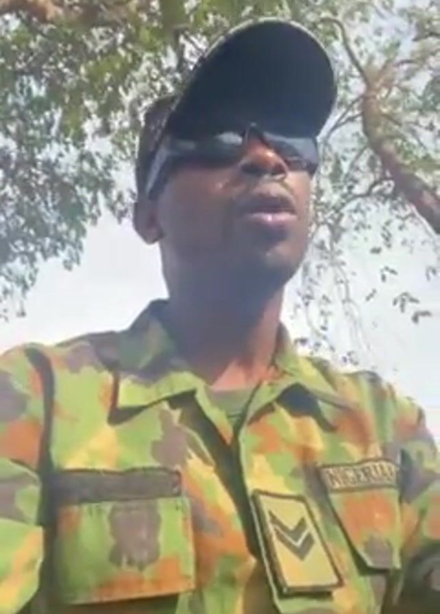A man in a Nigerian military uniform stands outside under a tree. He is wearing sunglasses and a black cap. He adjusts his sunglasses while speaking.